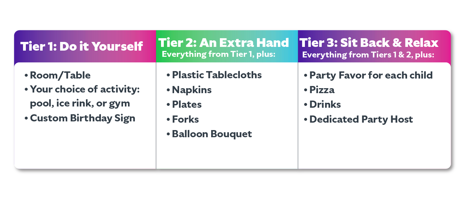 When you click through to purchase your party you’ll need: your party date, preferred party space, and the number of guests. You’ll choose your party tier and make a payment to confirm the reservation. Please note: if you don’t have a Jones Center account, you will need to create one.