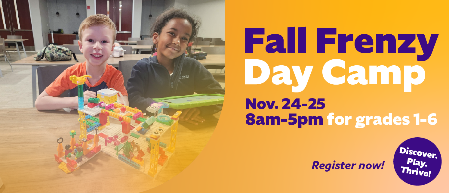 SCHOOL BREAK DAY CAMPSFun and engaging childcare during school breaks. Thanksgiving Day CampFall FrenzyNov. 24-25 | 8am-5pmGrades 1-6 $80 members | $100 public Register Now