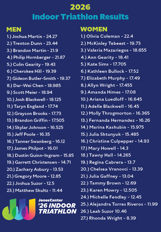The Indoor Triathlon is a swim, bike and run event — all taking place inside The Jones Center. Participants will have 10 minutes to swim, 20 minutes to bike and 15 minutes to run in order to log as many miles as possible. The event is the perfect opportunity for beginners to try their hand at a triathlon and for seasoned triathletes to gear up for spring competition season.