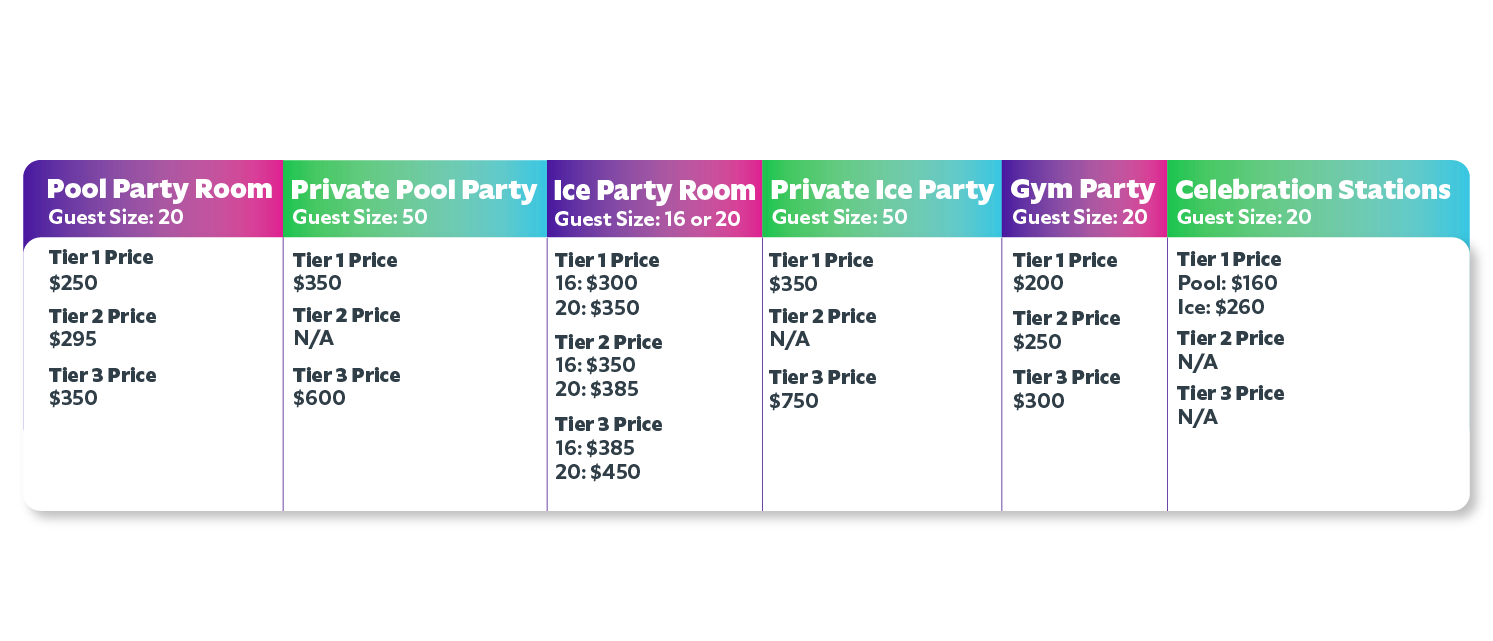 Swimming and ice-skating parties offer general play in the pool and ice rink during public session times.